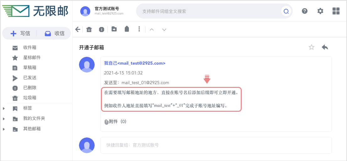 需要新邮箱接收信件时,只需在主账号后添加字母、数字或下划线,向该地址发送邮件即可自动开通子账号。