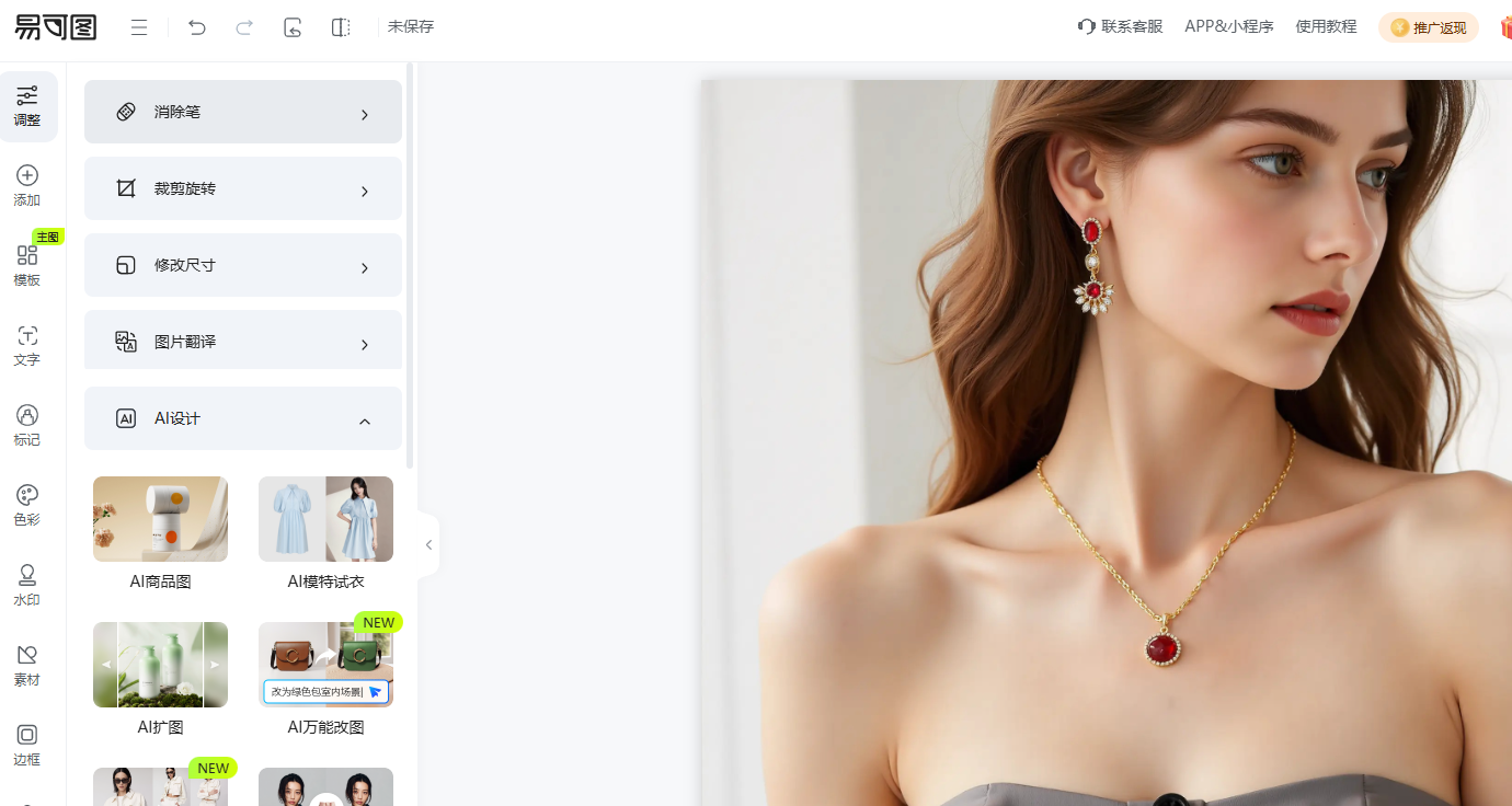 在众多在线修图平台中,易可图凭借其电商专属设计功能脱颖而出。该平台专为电商从业者打造,相较于传统PS软件更具场景适配性: