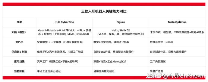 ▲CyberOne、Figure、Optimus三款人形机器人关键能力对比,有界UnKnown制图