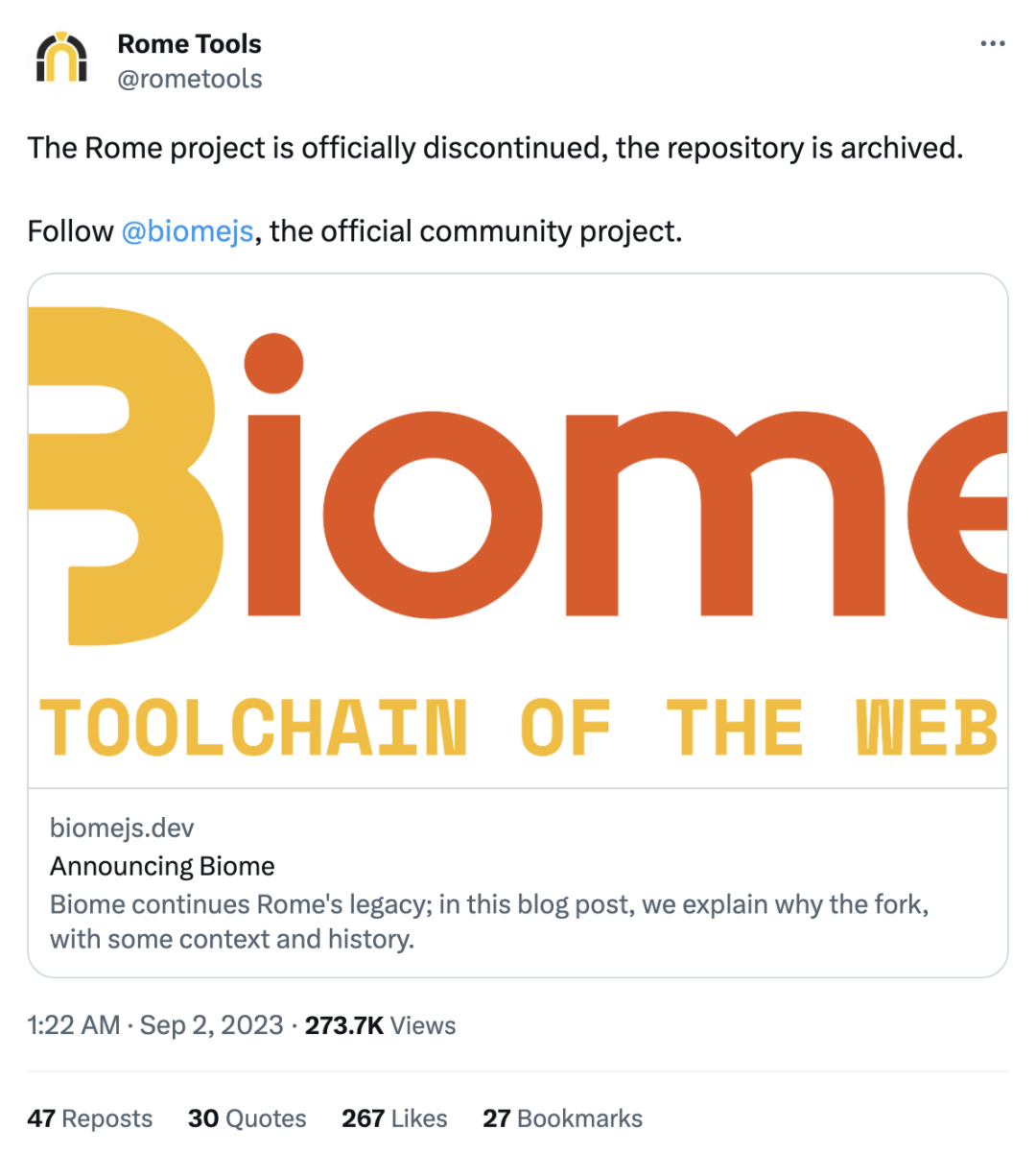 2023年8月29日,Emanuele Stoppa 和其他前 Rome 核心团队成员宣布了Biome的诞生,这是"Rome的官方分支"。Emanuele 表示 Rome 将不再维护,并且"与当前所有者联系的多次尝试均以失败告终",因此将以一个新的名字和项目重新开始。