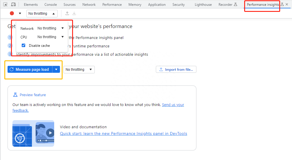 Performance insight是chrome Chrome DevTools中的自带工具(Chrome102 版本发布),目前还是在chrome DevTool中启动即可,如下图所示:我们可以模拟cpu,选择4x slowdown,就开始模拟4倍低速CPU,同理还可以模拟网络应对不同网络的测试需求。