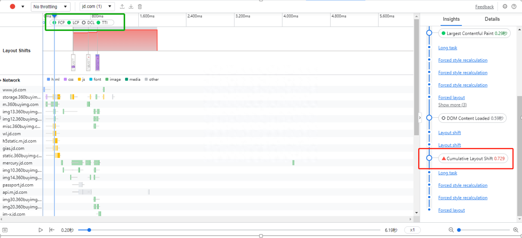 Performance insight工具最方便的部分是"insights"面板,它位于面板的最右侧。它以垂直时间线的形式按照事件发生的顺序显示事件,如渲染阻塞请求、长任务、布局变化等。点击这些具体事件将导航到"详细信息"选项卡,它给出了关于它的潜在原因和受它影响的元素等的详细信息,在Details中看到影响性能问题的各种因素,遗憾的是修复方案仍然需要翻墙。我们以jd首页为例,我们很容易看到Cumulative Layout shift 慢(红色框,红色箭头被认定为严重超标,需要整改),想要进一步进行优化,点击该事件就可以查看关于问题的详细描述和具体的优化方案。另外在页面的顶端(绿色框)我们可以方便的看到当前页面FCP,LCP,DCL和TTI这些参数指标,关于指标的含义和参考时间的详情可以参考文章: