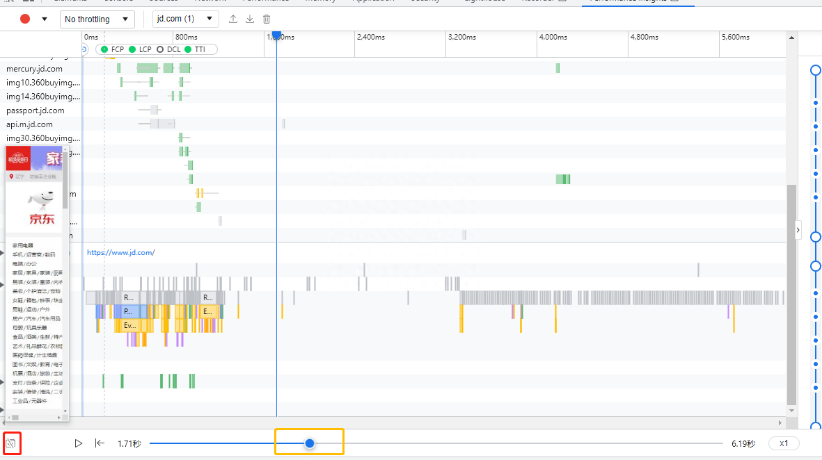 点击下图中的Toggle visual preview 按钮可以看到页面具体时间点展示的UI情况,拖动滚动条就可以方便的看到不同时间点UI加载的变化了。