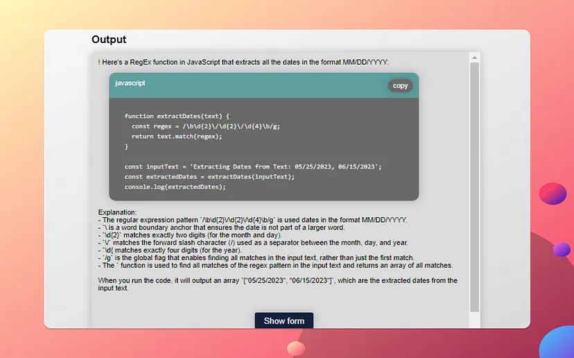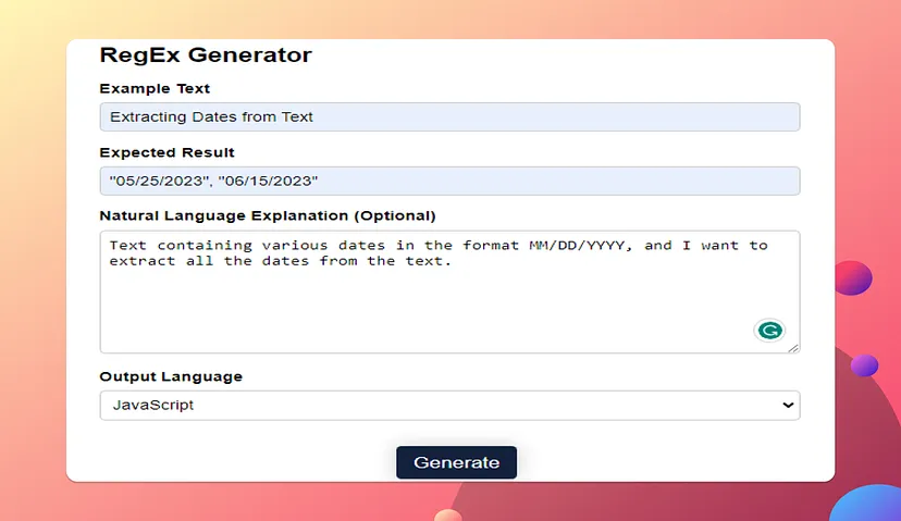 RegexGPT 是编写 RegEx 模式的绝佳工具。它真的令人难以置信。试一试,你就知道了。它的工作原理是:给它一个示例文本,输入预期结果,你也可以稍微解释一下,这取决于你,然后选择要生成 RegEx 的语言,点击生成按钮。