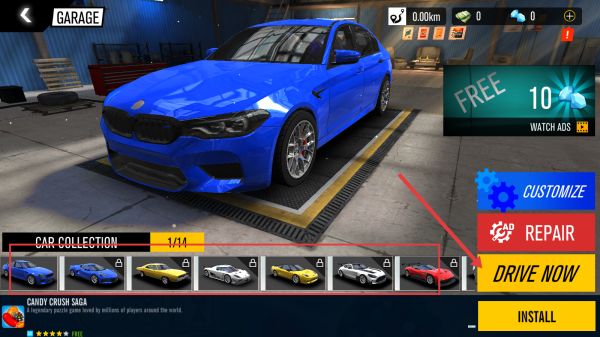 2、在车库界面,选择已解锁的车辆,再次点击【DRIVENOW】按钮启动游戏。