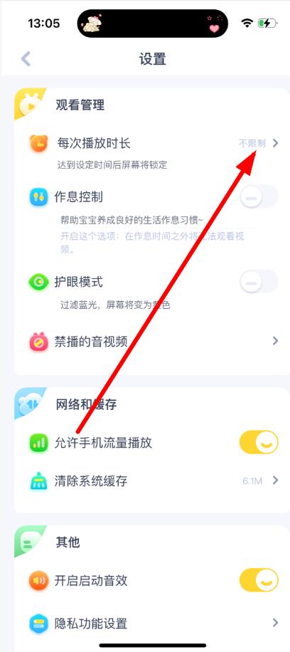 2、在【设置】界面中点击【每次播放时长】选项。