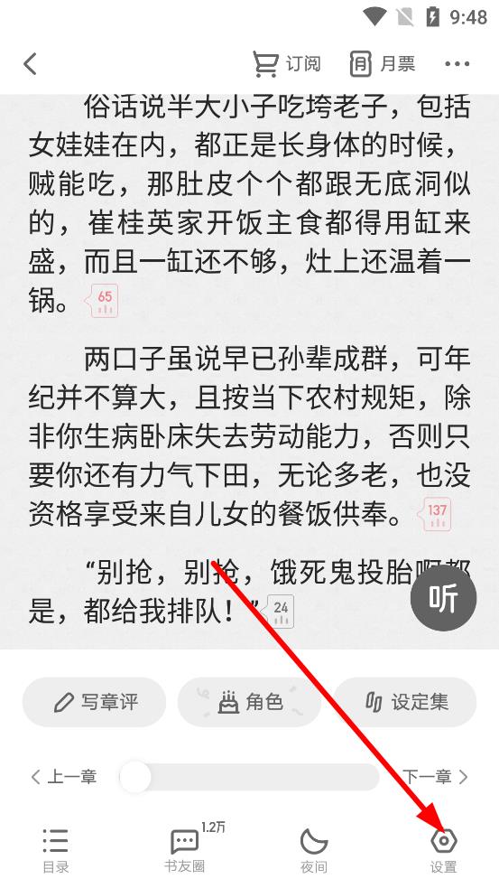 1、在起点读书APP中打开要阅读的书籍,进入阅读界面,点击屏幕右下角的设置按钮。