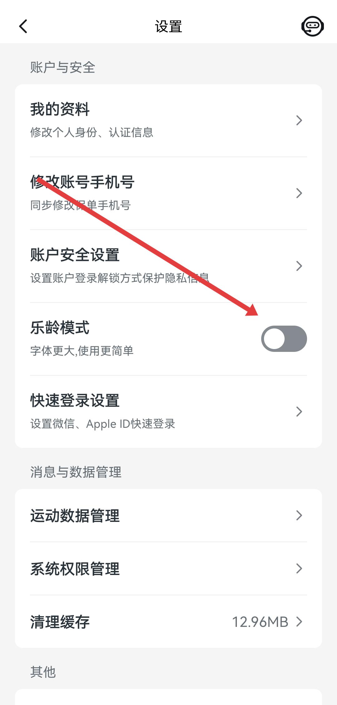 3、在设置界面找到乐龄模式开关,点击开启,即可切换乐龄模式界面。
