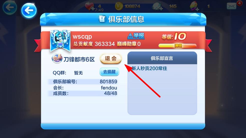 3、在俱乐部信息页面里找到退会按钮,点击该按钮按照提示确认操作后即可成功退出俱乐部。