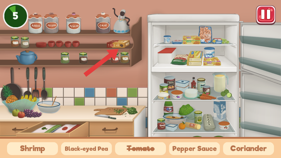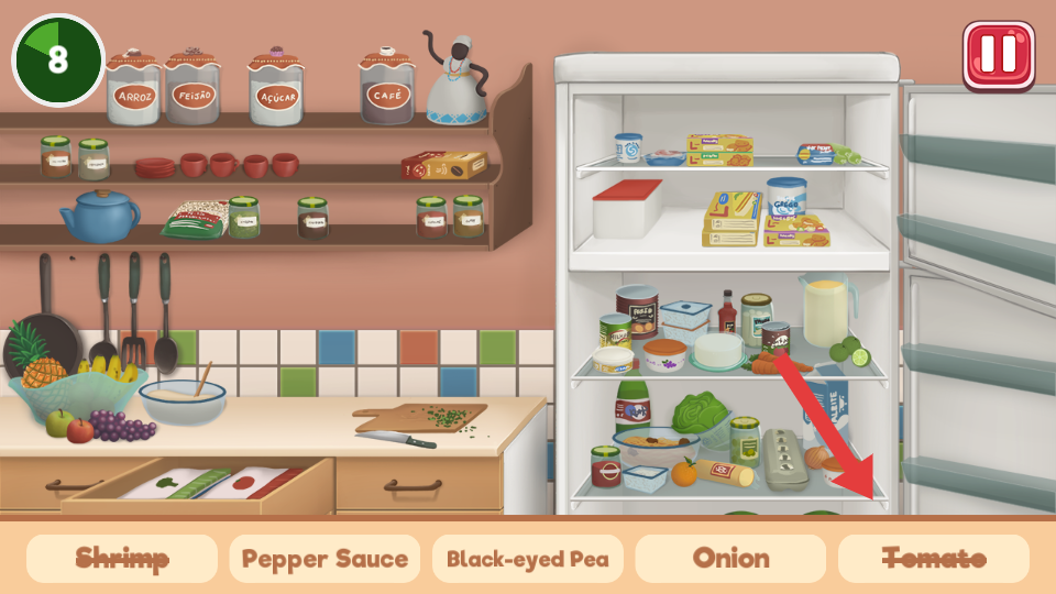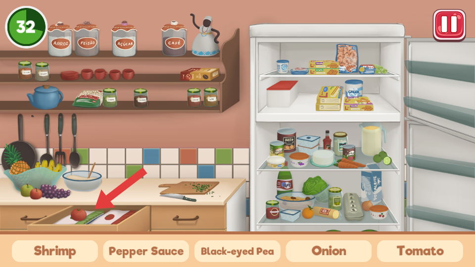 1、进入厨房场景后,优先检查冰箱与橱柜两大核心区域,冰箱内可获取虾、黑眼豆等需冷藏的食材。