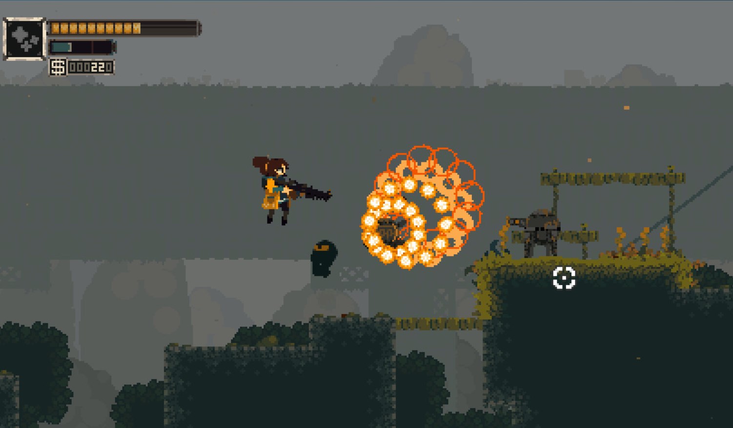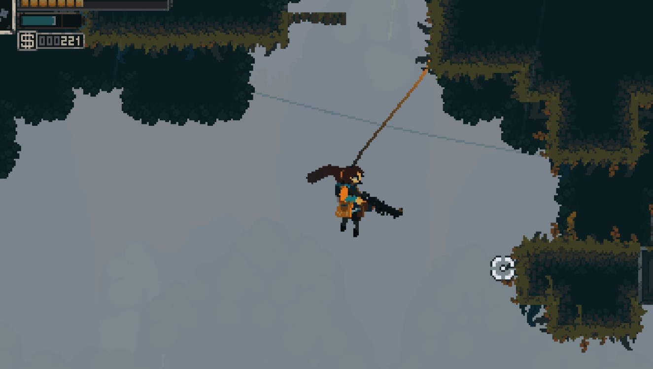 《Rusted Moss》引入了一种独特的钩爪系统——橡皮绳摆荡。这一系统不仅允许玩家进行灵活的位移操作,还结合了弹力物理特性。