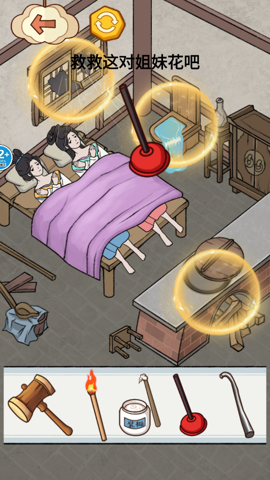 3、在此画面中,需在三个地方,使用三种合适的物品即可。