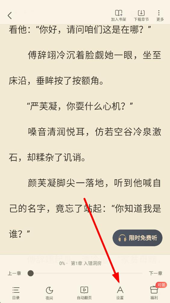 2、在阅读界面中,点击屏幕中间位置,唤出设置菜单,然后点击下方的设置选项。