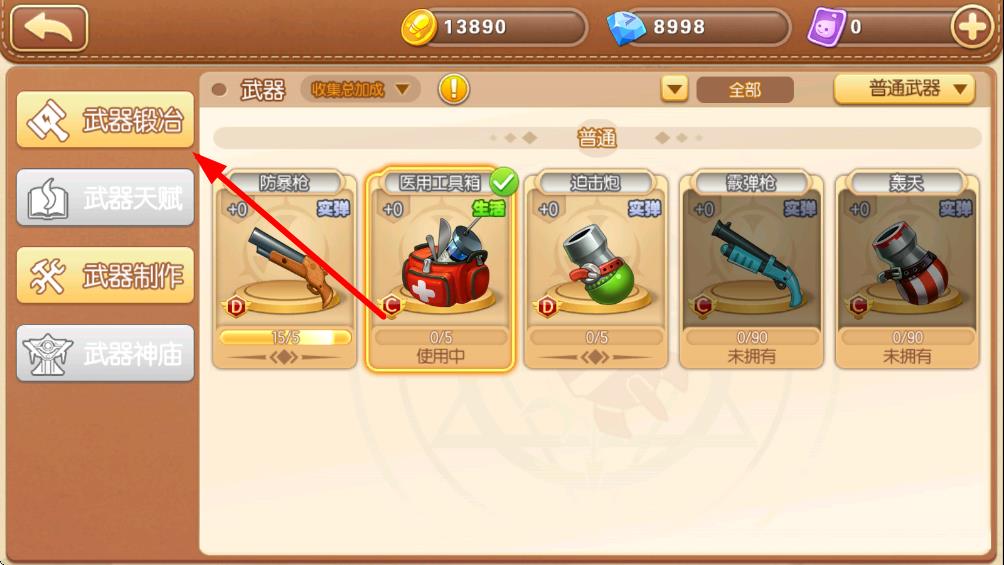 3、在武器界面里,点击左侧的武器锻冶选项。