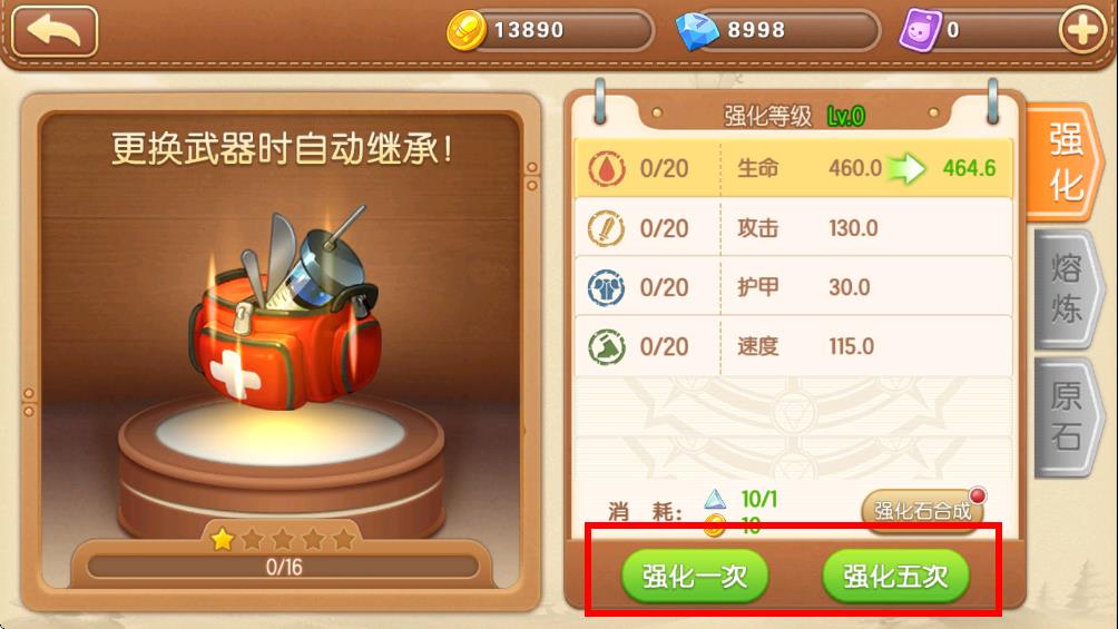4、进入武器锻冶页面后,选择想要强化的武器,接着点击右侧的强化一次或强化五次按钮,消耗相应材料即可对武器进行强化。