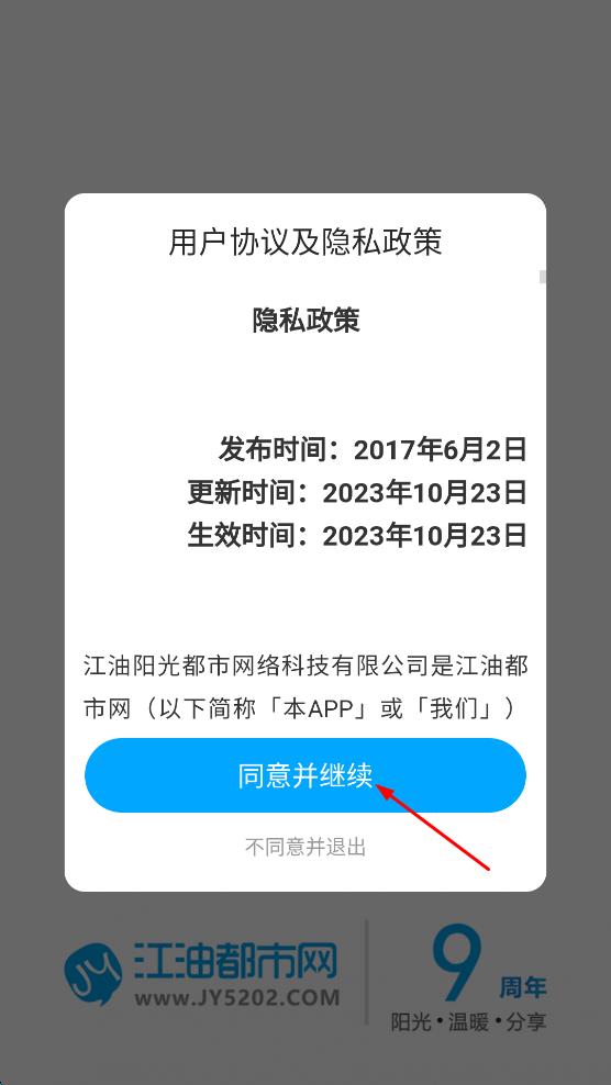 1、打开江油都市网App,在用户协议及隐私政策页面,点击“同意并继续”按钮。
