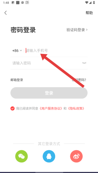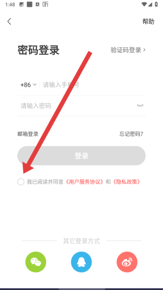 3、切换到密码登录页面时,需先点击勾选我已阅读并同意按钮。