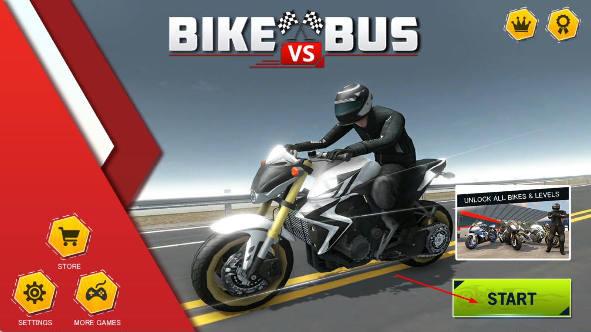 1、点击【START】,进入【摩托vs巴士】游戏,开启摩托车竞速挑战。