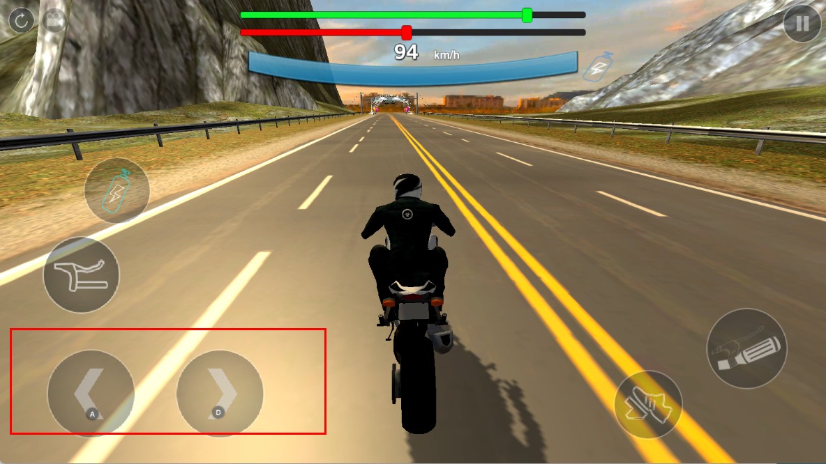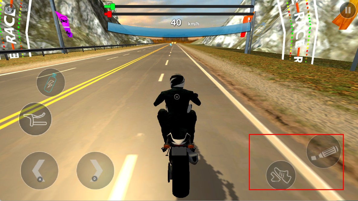 2、在竞速界面,用右侧加速等按钮,提升摩托车速度与刹车减速,保持领先。
