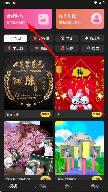 1、打开舞记APP,点击合成照片选项。