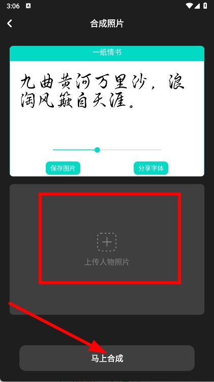 3、接着点击上传人物照片 ,选择需要合成的人物照片,点击马上合成。