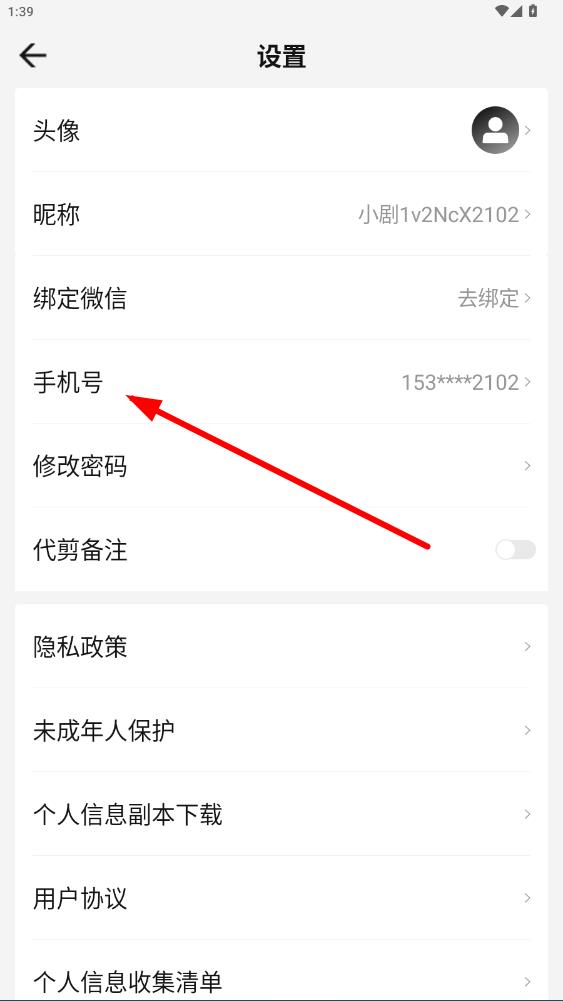 3、在设置界面里,点击手机号选项,进入手机号修改流程。