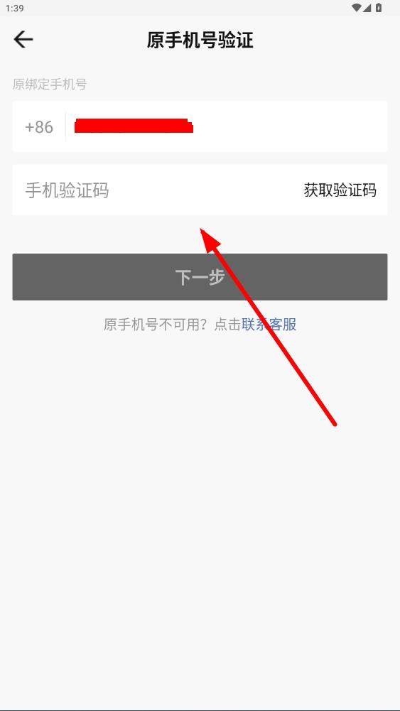 4、在原手机号验证页面,输入原绑定手机号收到的手机验证码,验证通过后按后续提示,完成手机号修改。