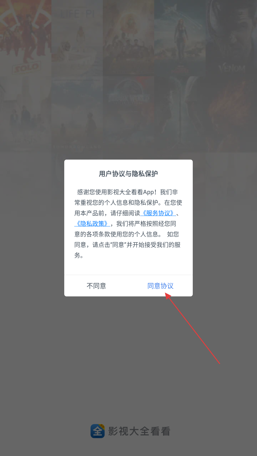 1、打开影视大全看看APP,进入时会弹出用户协议与隐私保护,点击同意协议的按钮。