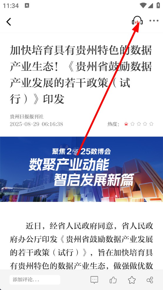 2、进入新闻文章详情页后,点击页面右上角的耳机形状的听新闻图标。