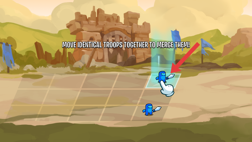 2、游玩中依照屏幕上的提示,长按相同的兵种并拖动使其靠近,就能够通过移动位置完成兵种合并。