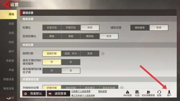 2、在设置页面的底部,找到并点击用户选项,进入用户中心界面。