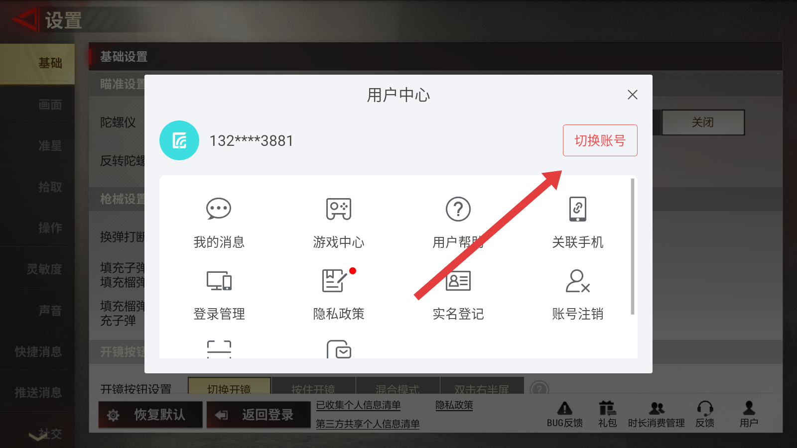 3、在用户中心界面中,点击切换账号按钮,然后按照系统提示,选择登录方式并输入新账号信息,即可完成换号登录操作。