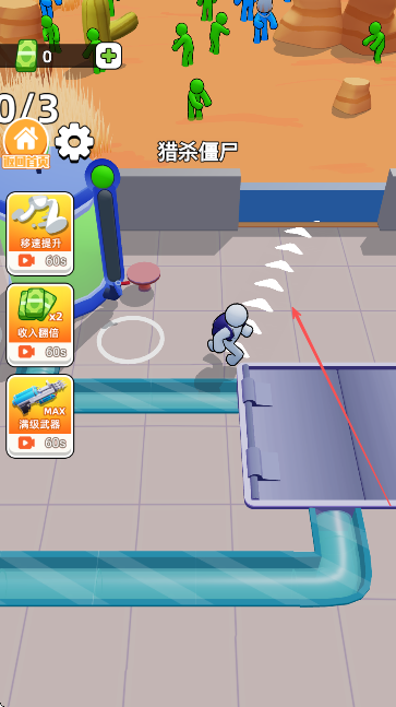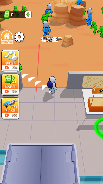 2、在场景中寻找僵尸,发现后靠近僵尸,准备进行抓捕,同时留意屏幕上方的各种增益选项,如移速提升等。