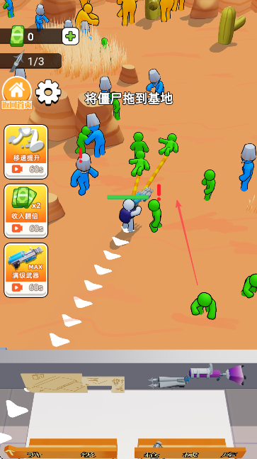 3、成功抓住僵尸后,按照任务提示将僵尸拖到基地,沿着箭头方向移动,完成任务可获取奖励,提升关卡进度。