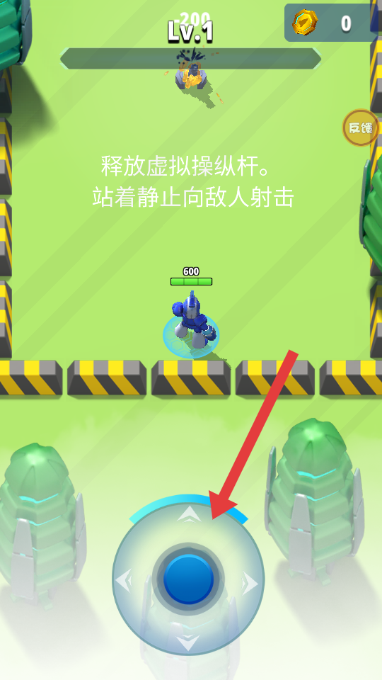 1、游戏初期,释放虚拟操纵杆,让蓝色机甲站定静止,向敌方单位射击,利用初始站位精准打击上方敌人。
