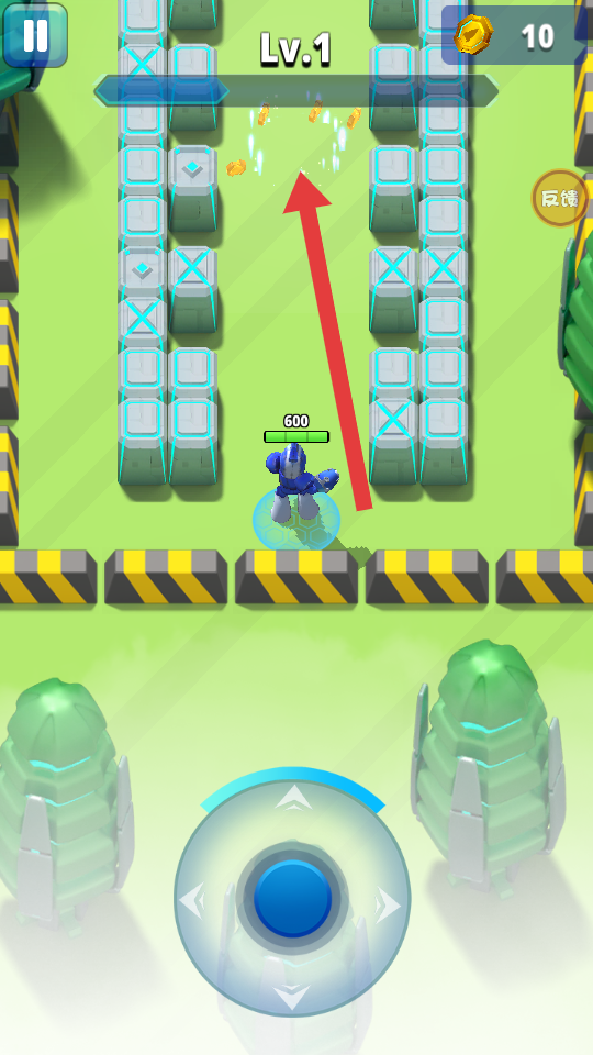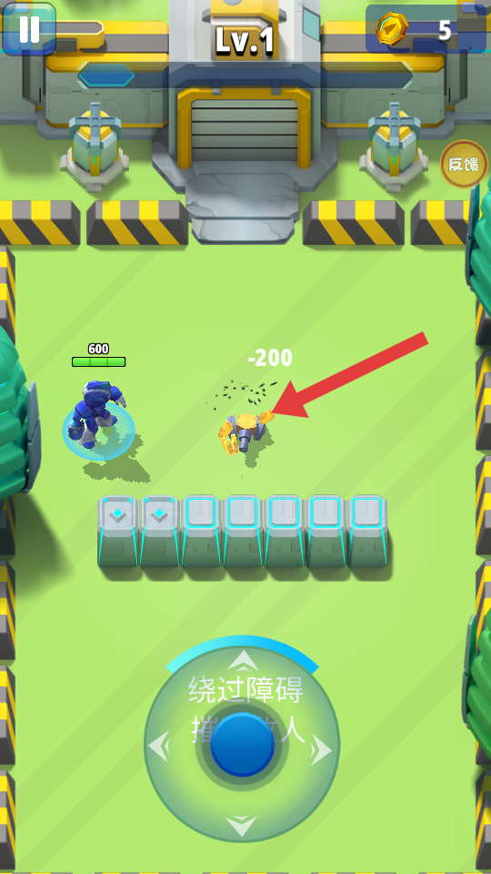 2、遇到带有障碍的场景时,通过虚拟操纵杆操控机甲移动,再瞄准敌人攻击,同时可收集击败敌人掉落的金币。