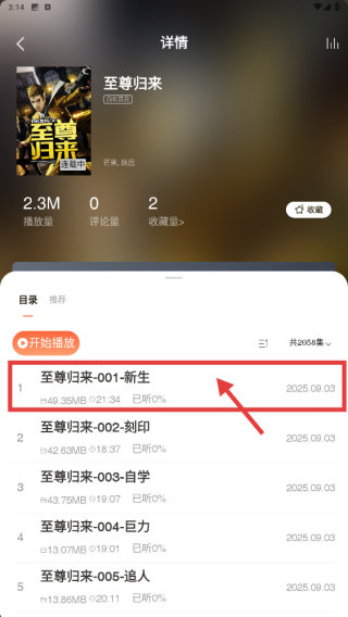 4、在详情页,点击至尊归来-001-新生选项,开始收听该有声读物。