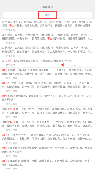 3、在搜索结果中找到目标诗词内容,点击进入诗词详情页。