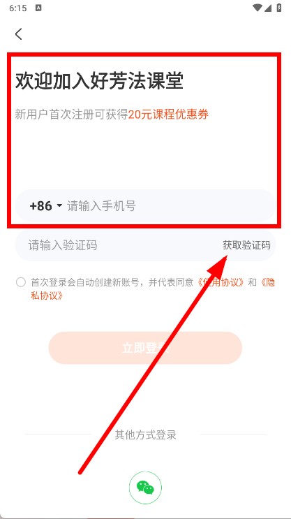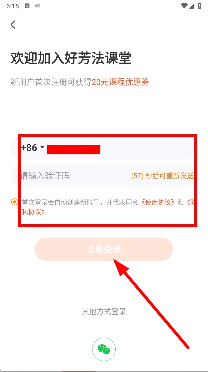 4、输入收到的验证码,勾选同意相关协议后,点击立即登录,即可完成注册登录。