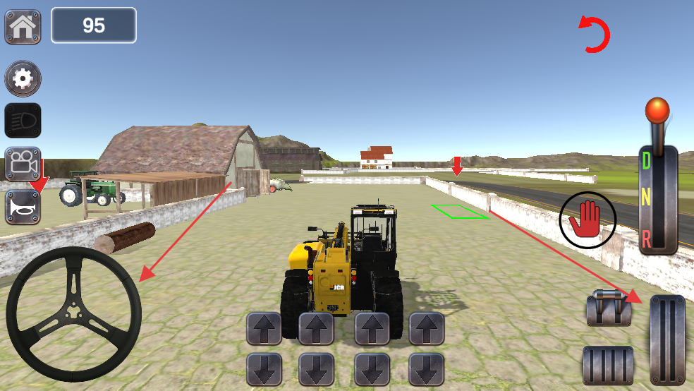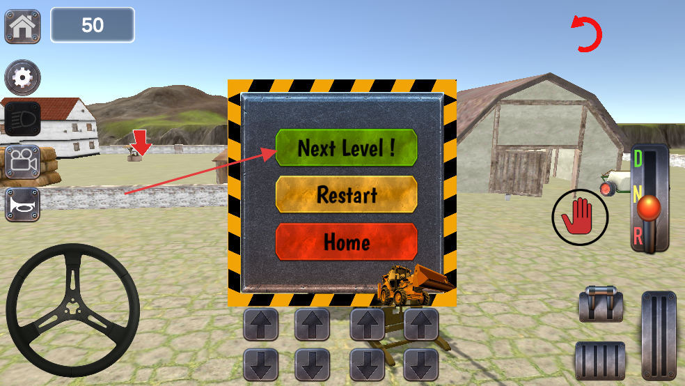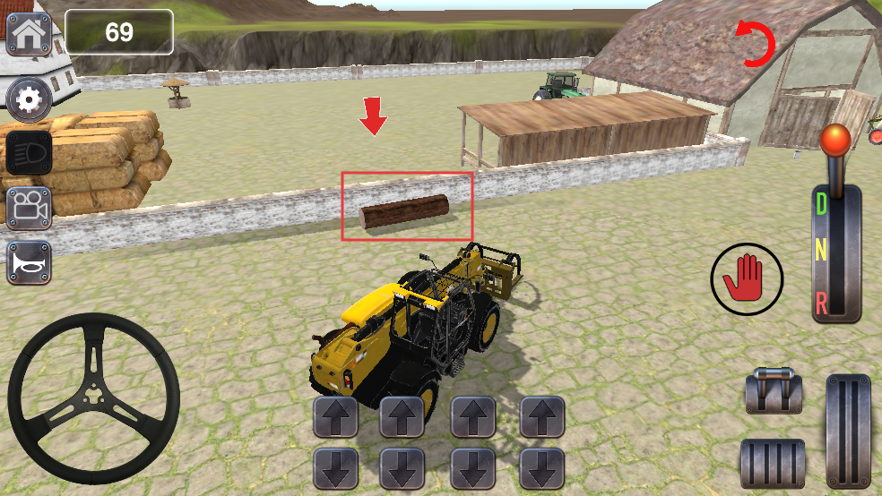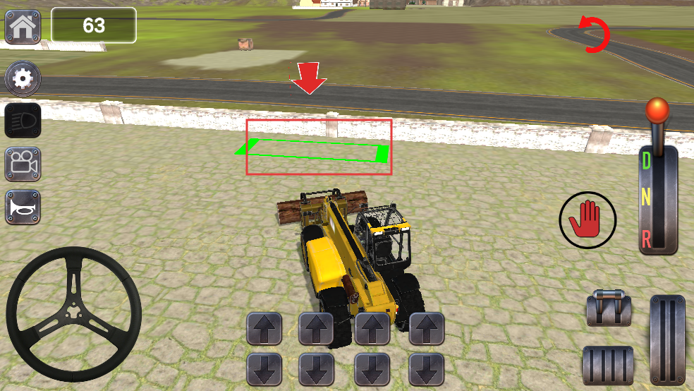 1、操控方向盘调整工程车方向,利用下方箭头按钮控制行驶,朝着目标区域前进,准备执行搬运任务。