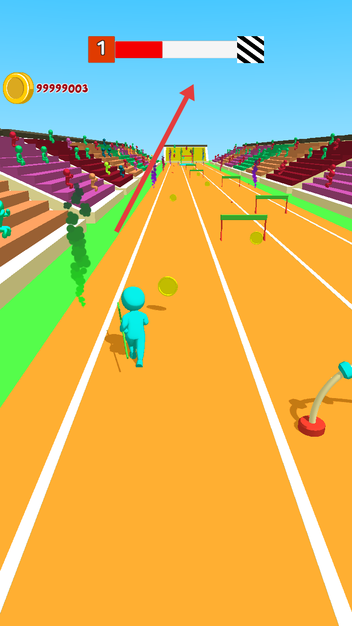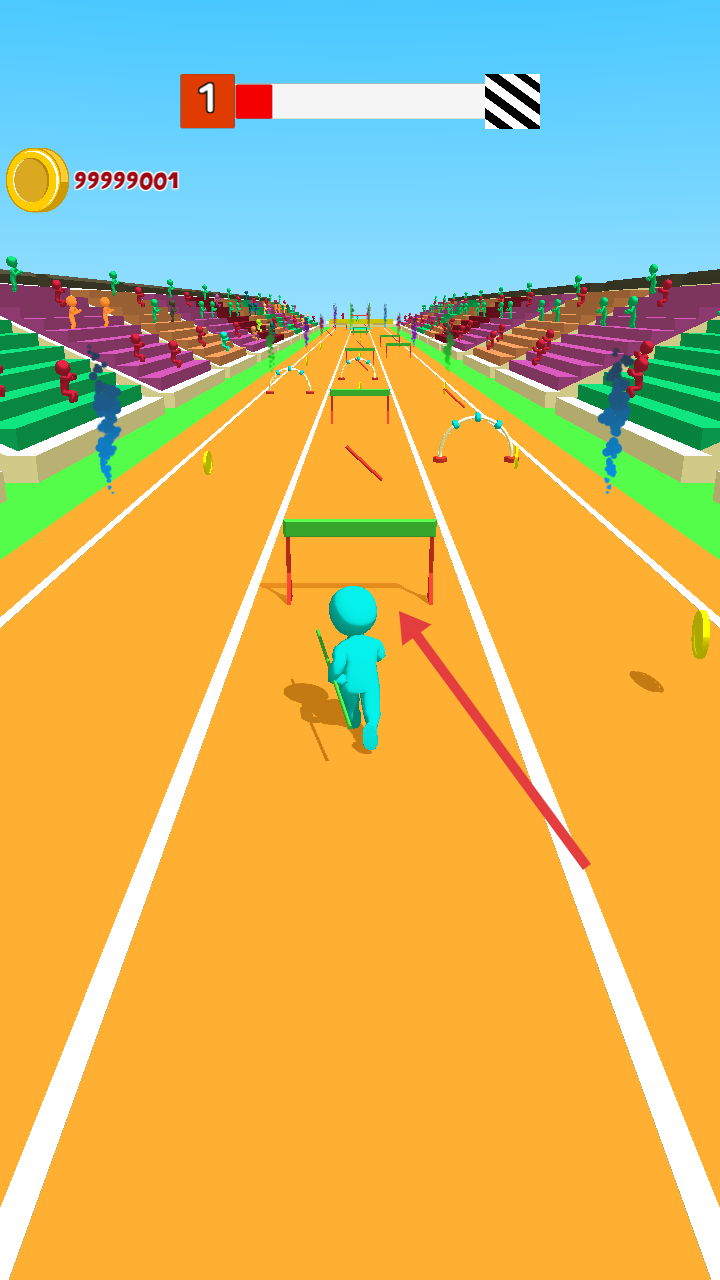 2、在跑道上操控角色,精准跨越绿色跨栏,同时收集金币,推进关卡进度。