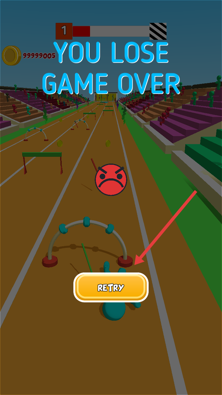 4、若挑战失败,显示YOULOSEGAMEOVER,点击RETRY按钮重新挑战,调整策略后再次尝试跑酷跨栏。