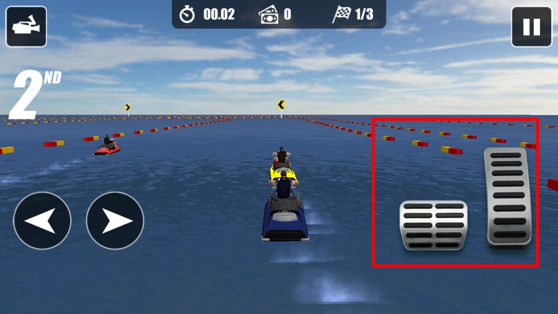 3、比赛时,点击右侧油门踏板,可让水上摩托加速,在赛道上快速行驶。