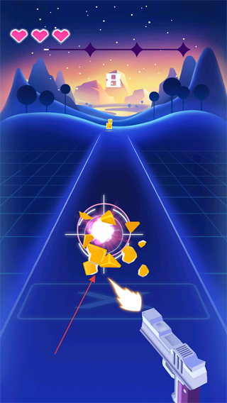 1、进入游戏,屏幕上方显示爱心代表生命值,操控枪支射击前方黄色方块,避免方块撞击。