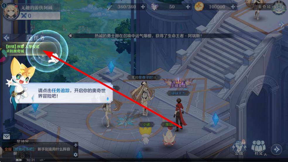 2、在任务列表中,查看当前任务,如剧情序章入学仪式-与叮叮对话,点击任务条目开始执行任务。