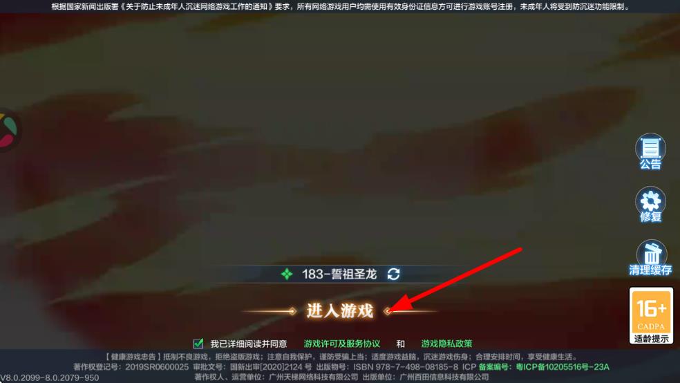 1、打开奥奇传说游戏,在初始界面阅读并勾选同意游戏许可及服务协议、游戏隐私政策,点击进入游戏按钮。