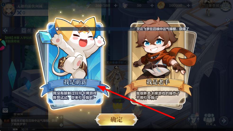 3、完成创角后,进入新手引导选择界面,根据自身情况选择我是萌新或我是老手,点击确定,正式进入游戏,完成新账号创建流程。