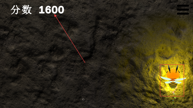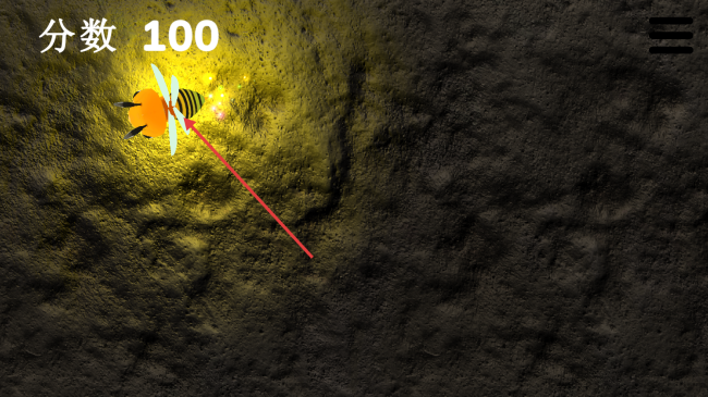 2、游戏中操控蜜蜂,在场景中移动,收集光点等元素,使分数从【分数-100】开始增长,积累分数。