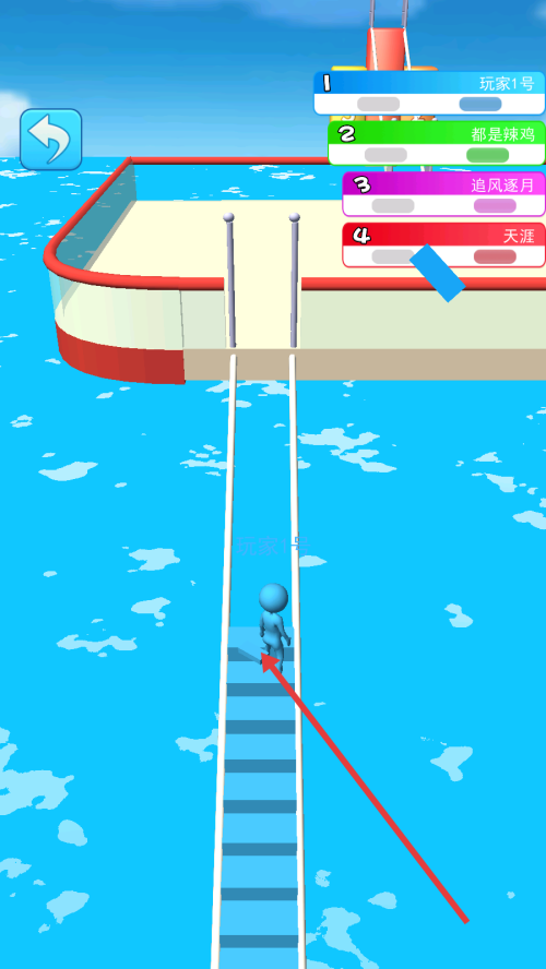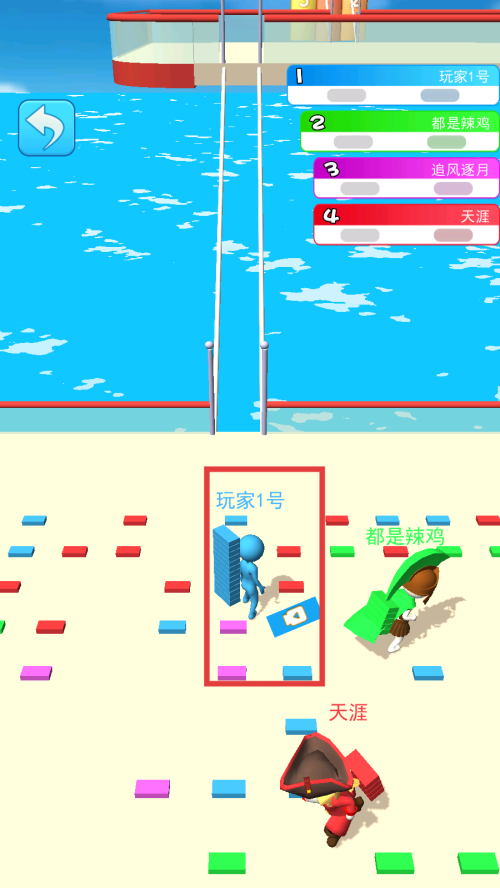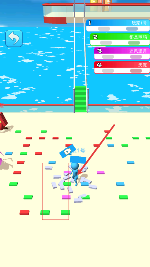 4、利用收集的方块搭建通道,沿着通道前进,向终点进发,争取率先到达,获得游戏胜利。