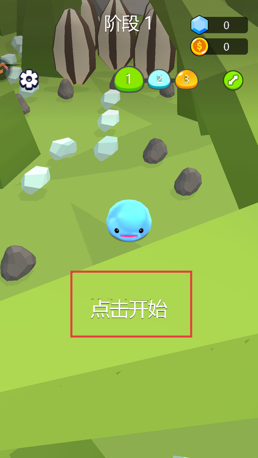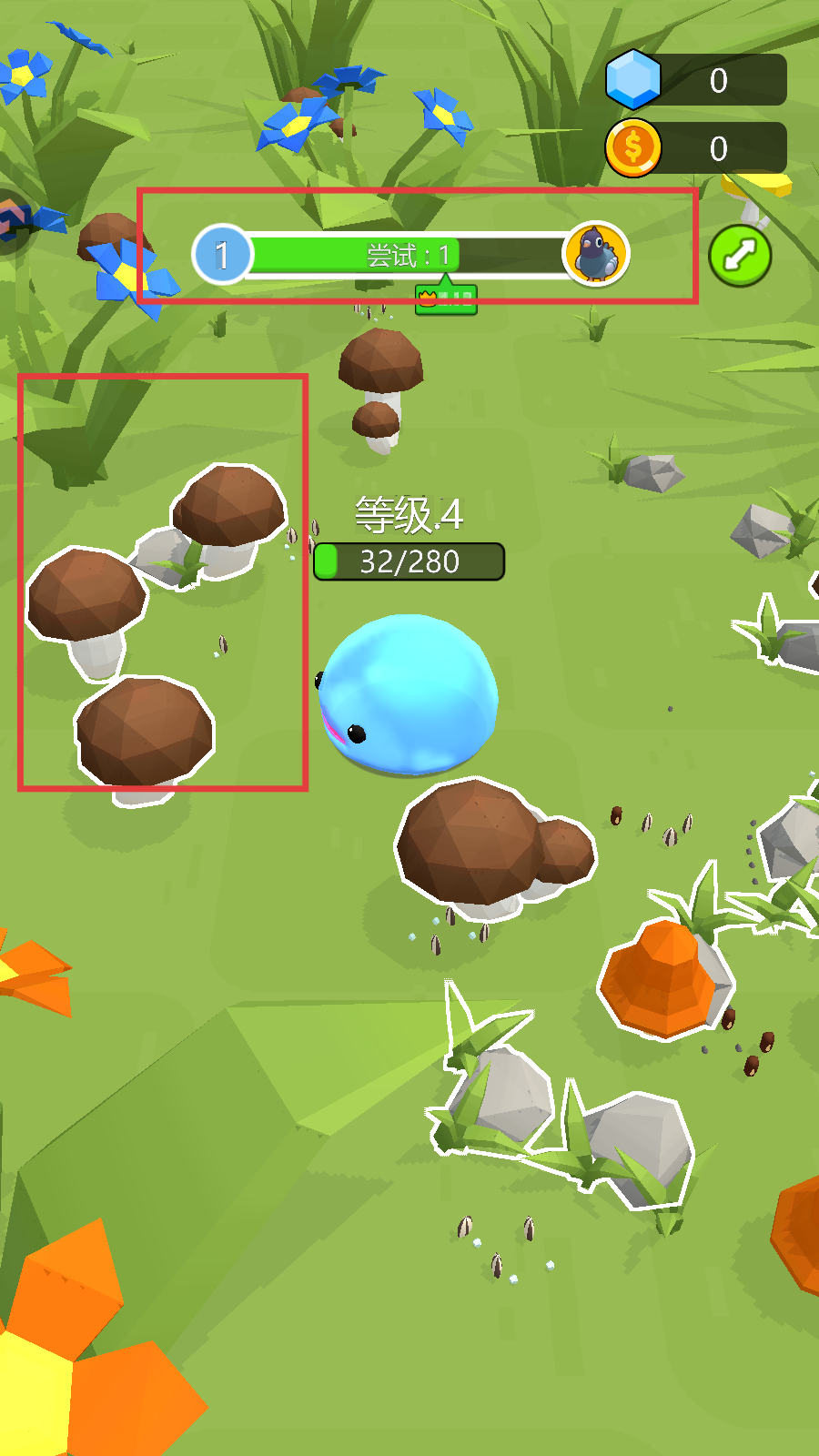 2、操控蓝色角色,在场景中收集物品提升等级。